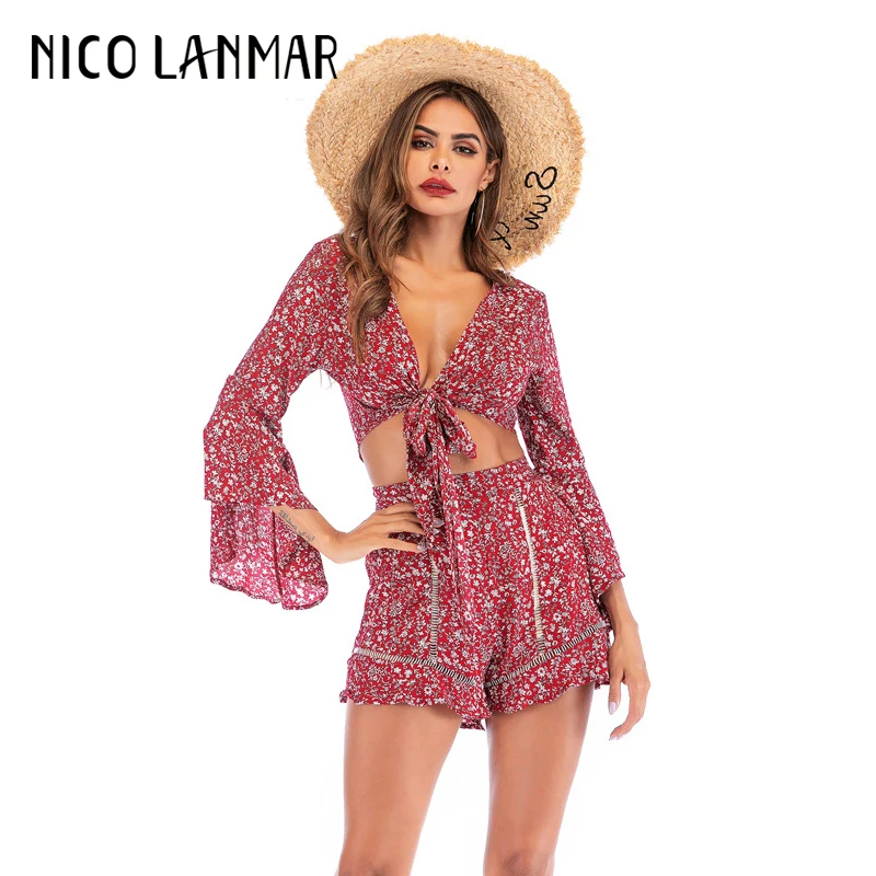 2PCS Women Clothing Sets Summer Casual Floral Chiffon V-neck Trumpet Sleeves Shirt+Shorts Two-piece